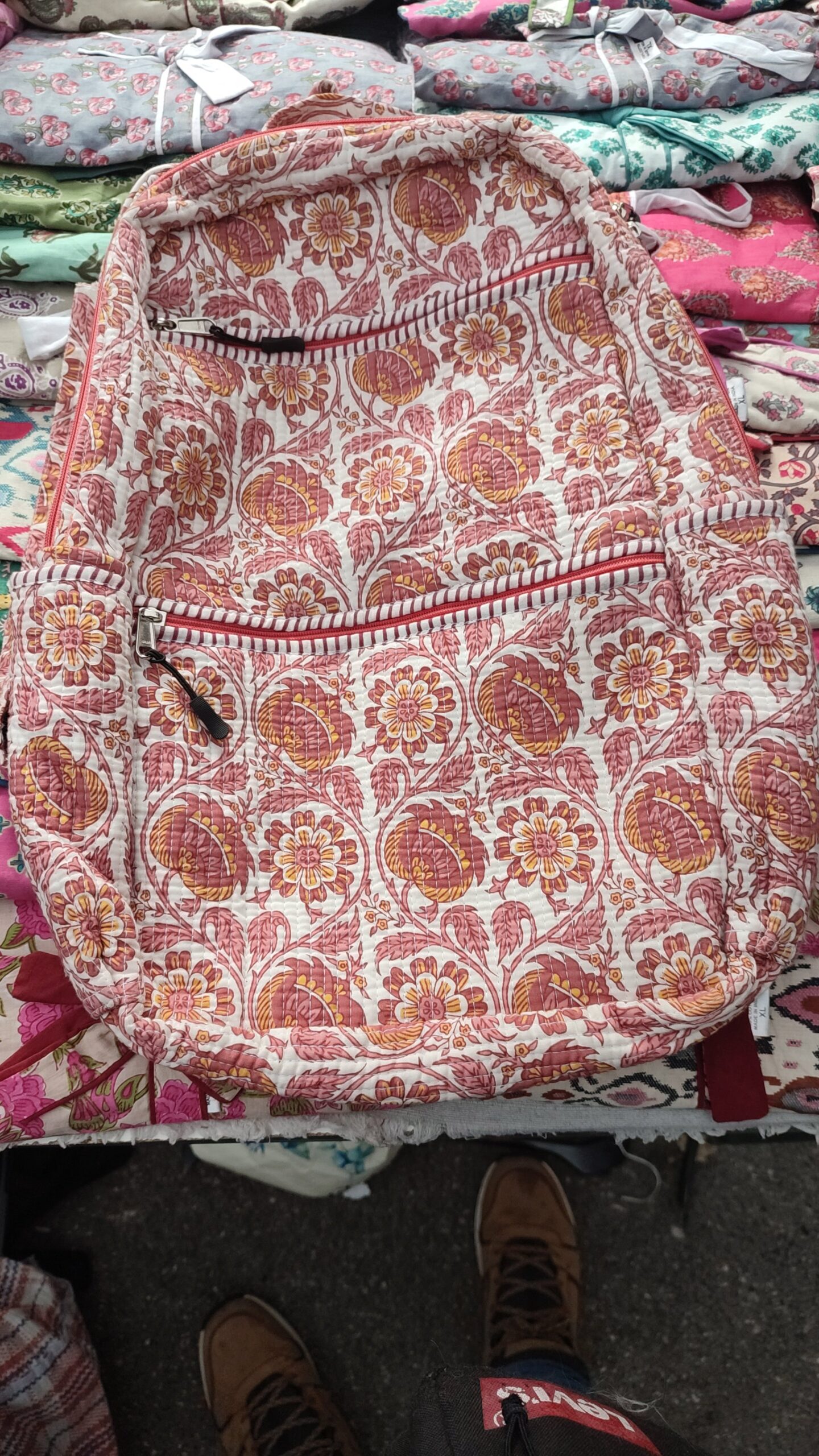 Mochila de tela «block print», tiene dos compartimentos con bolsillos por fuera y por dentro y en los lados.