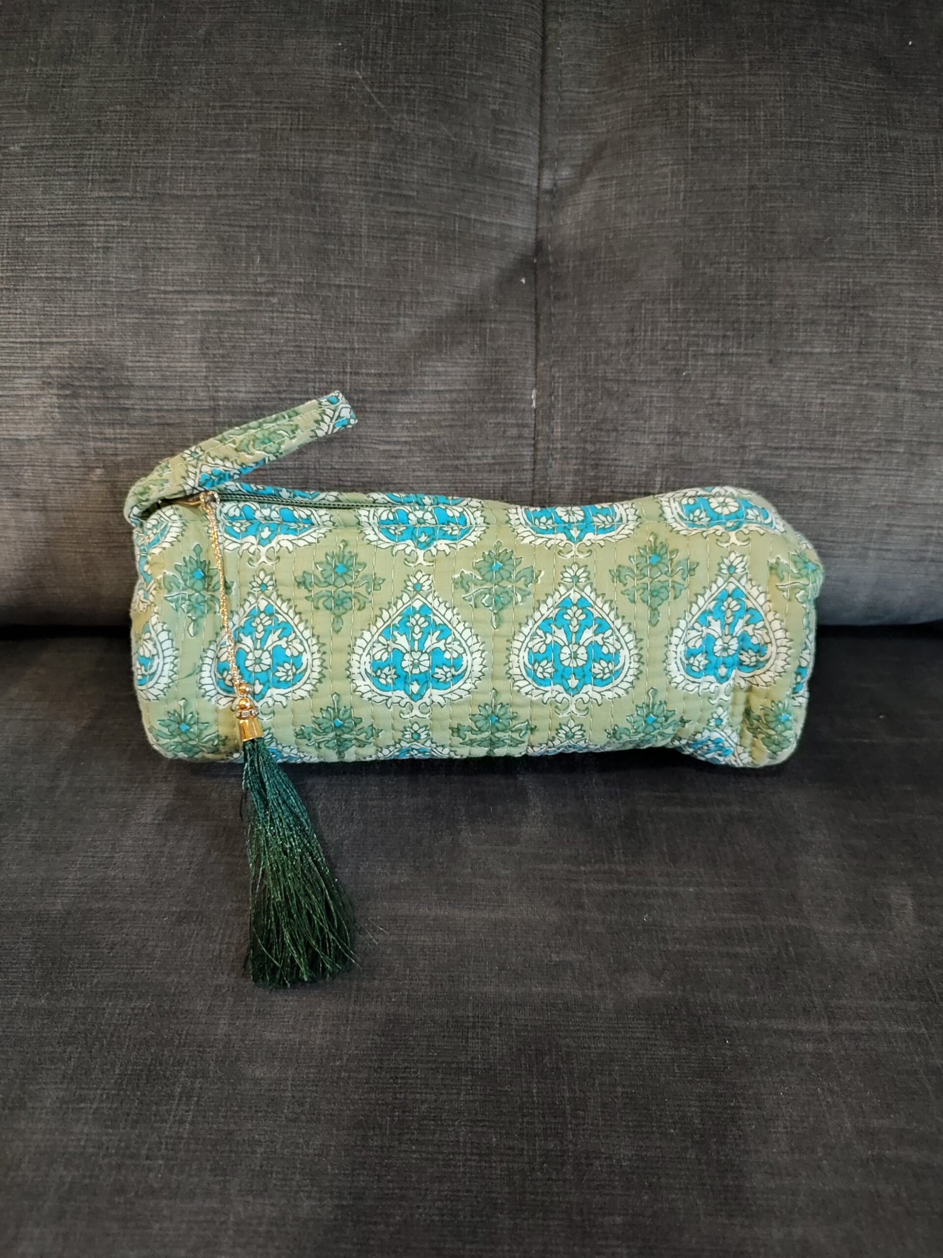 Neceser de tela «block print», con forma cilíndrica.