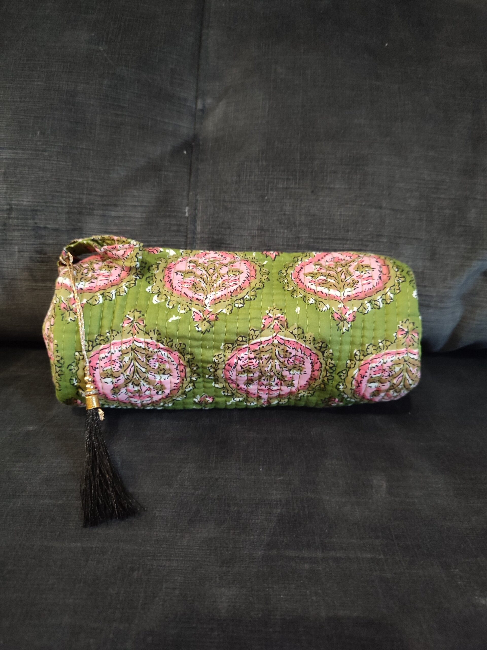 Neceser de tela «block print», con forma cilíndrica.